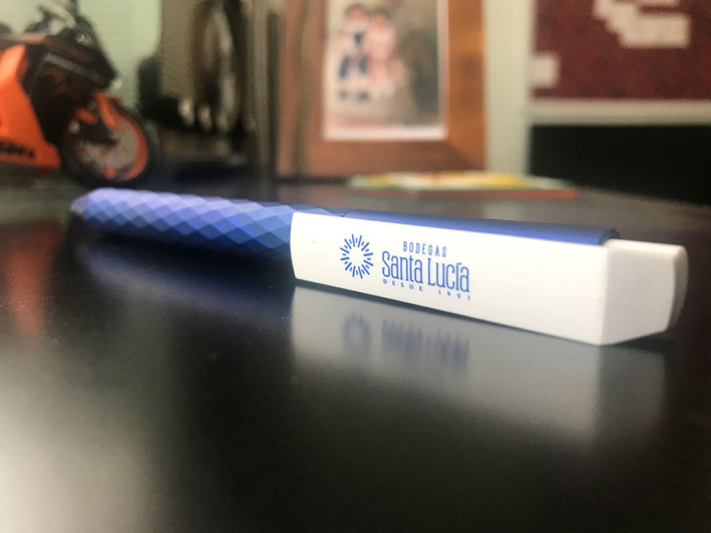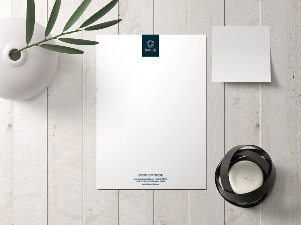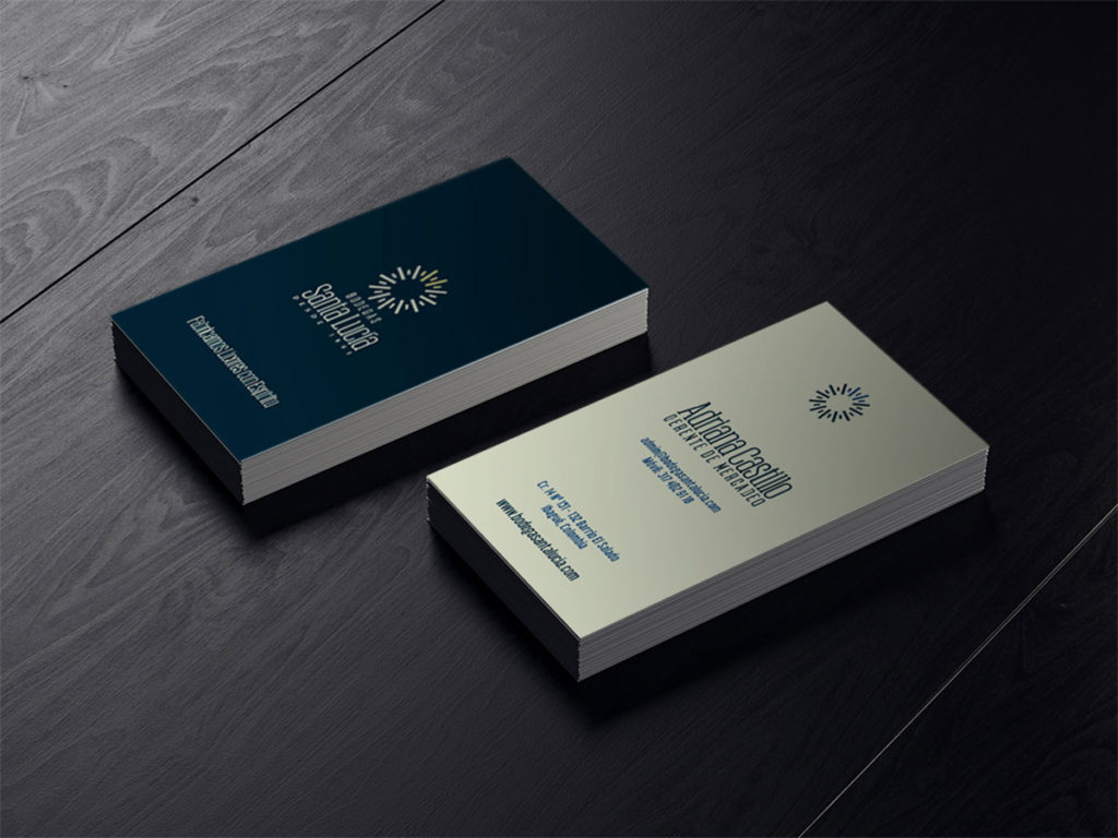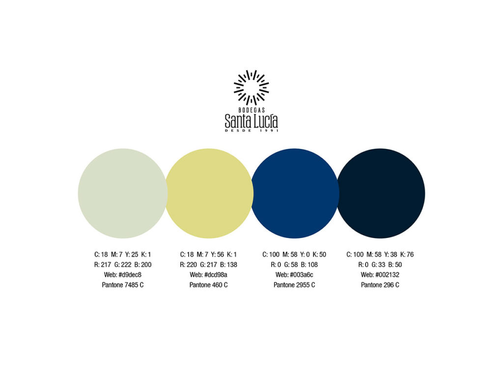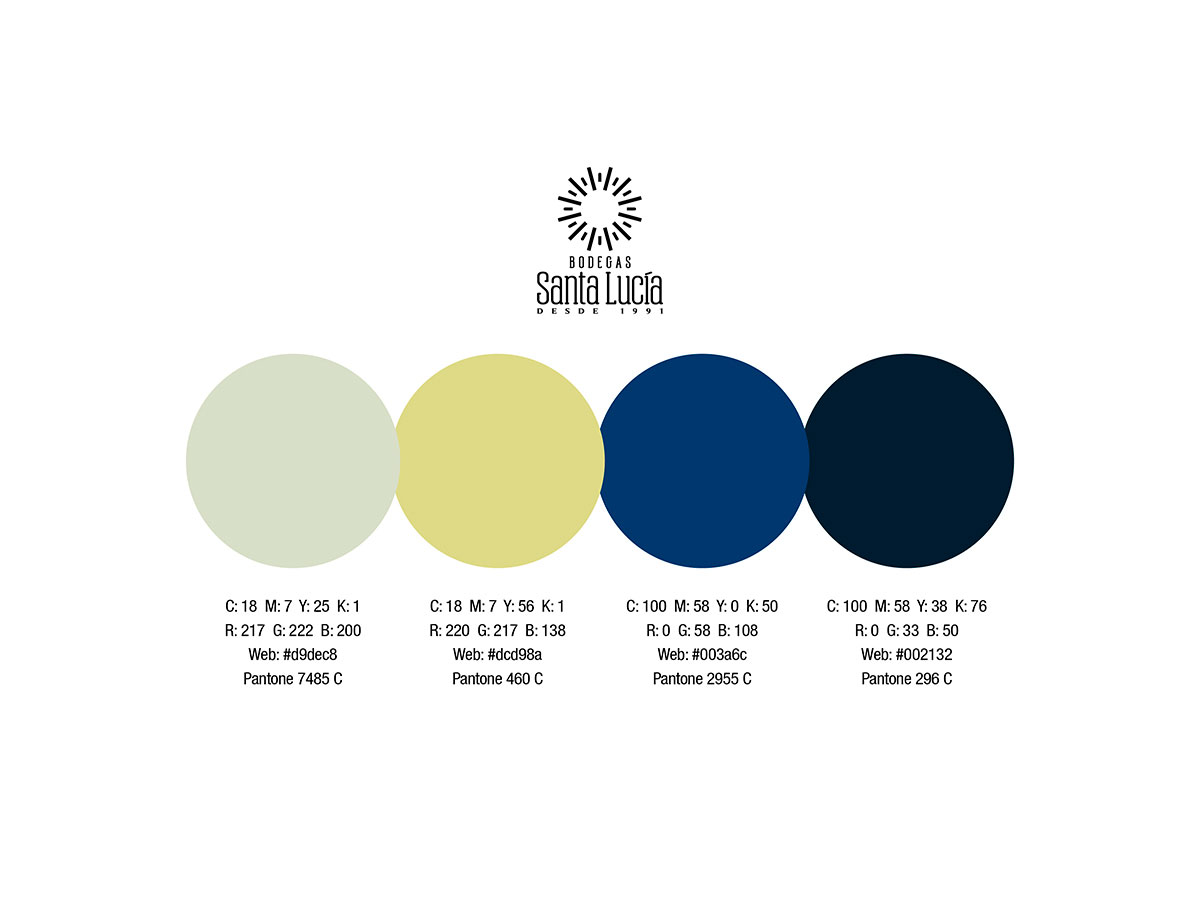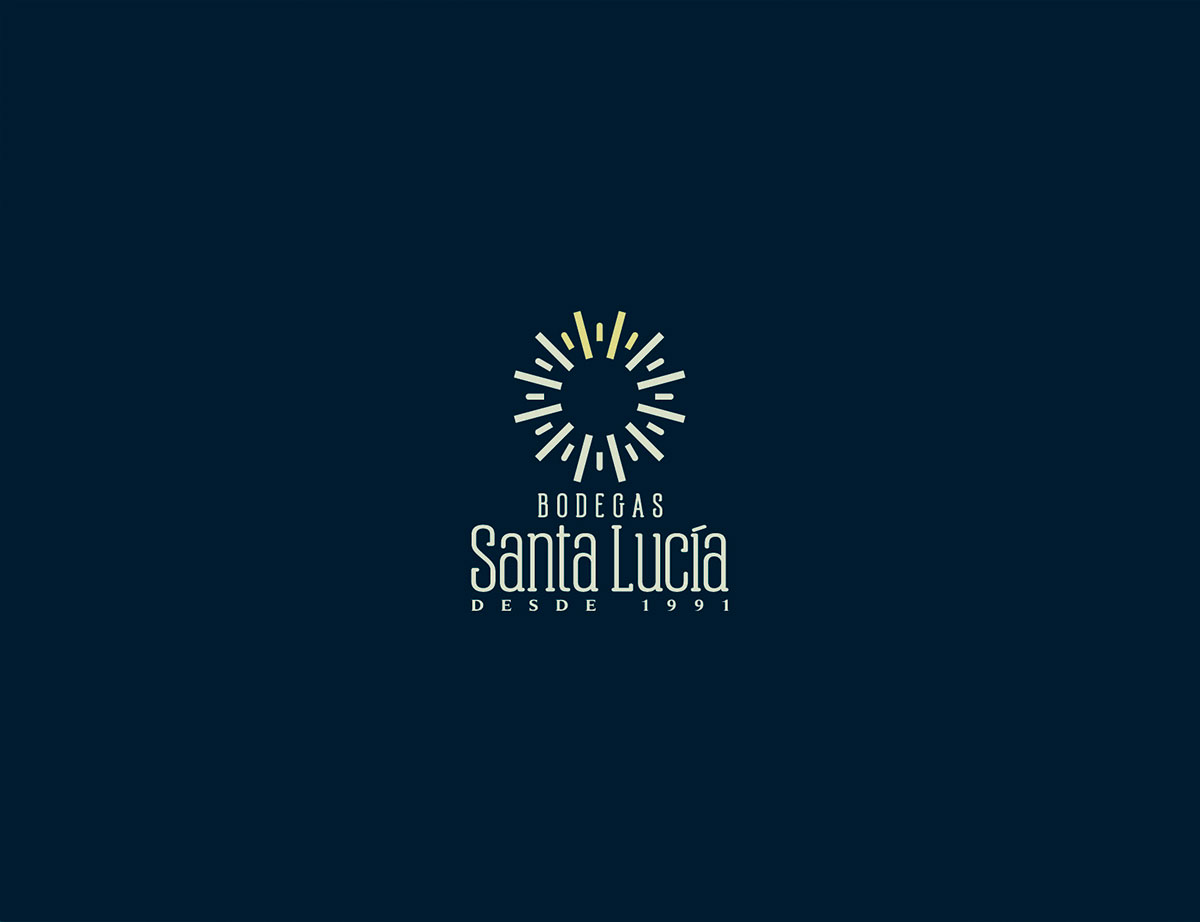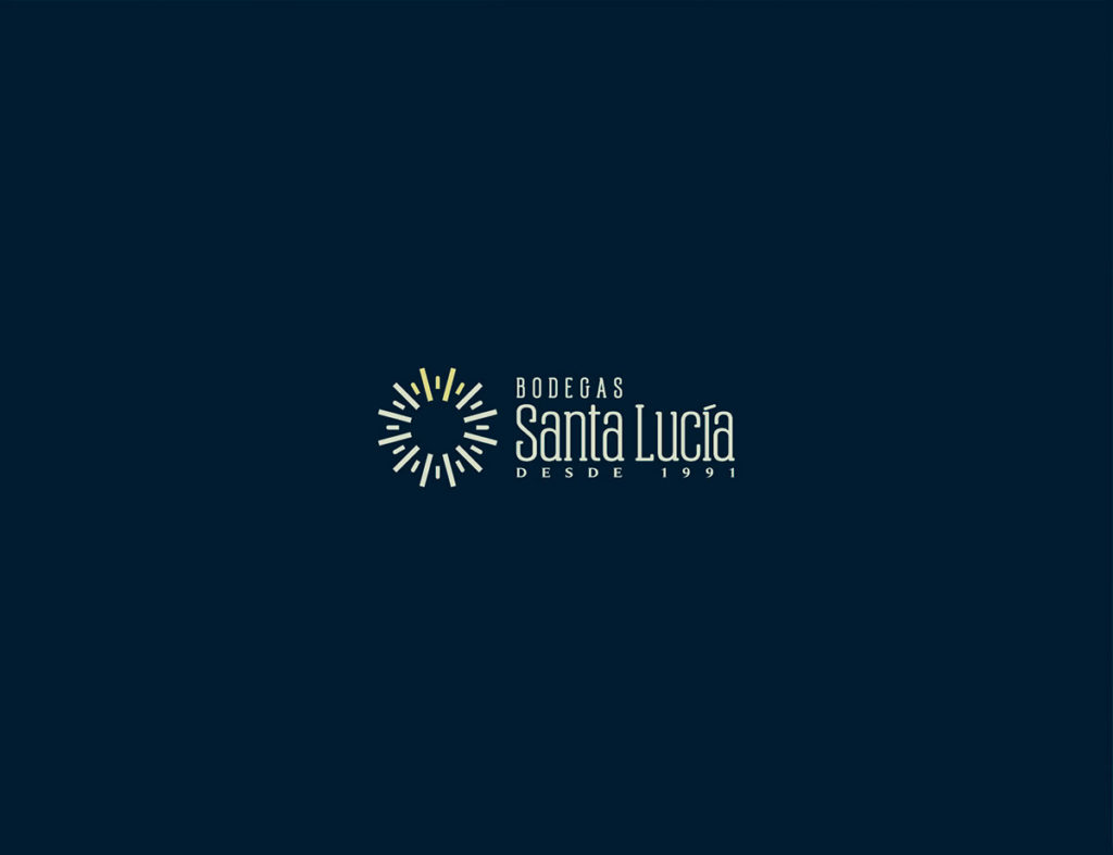 La tipografía se enfoca en comunicar solidez usando un estilo condensado para que el extenso nombre no ampliara el tamaño horizontal. Por este motivo también se situó el ‘BODEGAS’ arriba de ‘Santa Lucía’. El color comunica la personalidad elegante usando azul profundo para que contraste con el símbolo que comunica brillo y novedad.