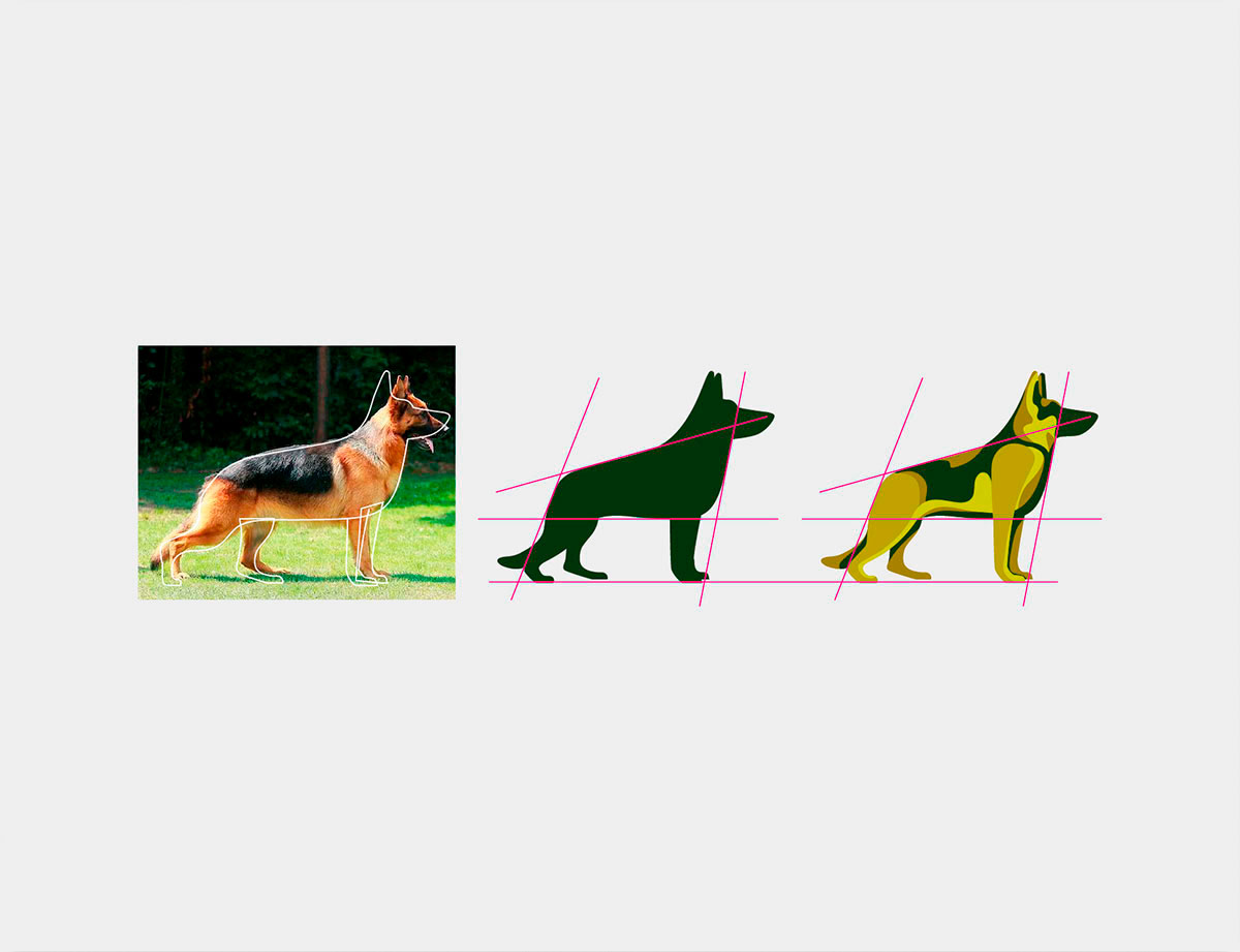 Elegimos el estilo tipográfico sans serif, en mayúscula, con interlinea cerrada para comunicar un vinculo fuerte. La elección de tonos verdes comunica la personalidad natural, ecológica y orgánica. Simbólicamente elegimos al pastor alemán como representación de aprendizaje canino y en el interior, de manera no literal, se integró un humano frente a su mascota para reafirmar el vínculo entre ellos.